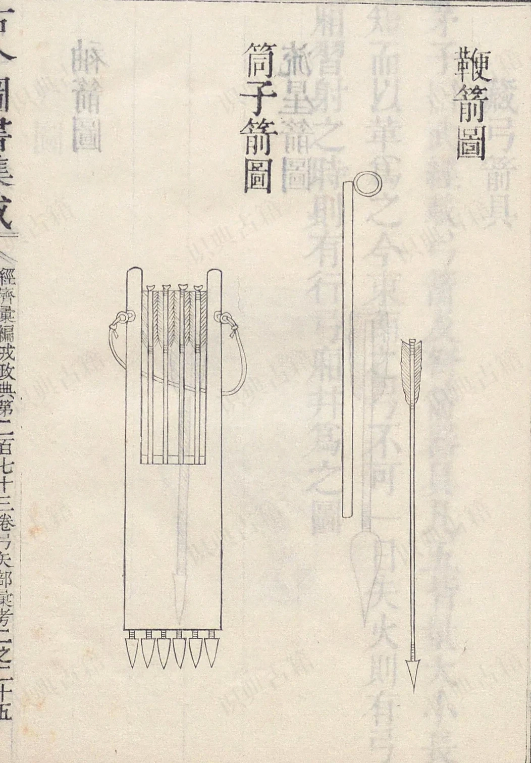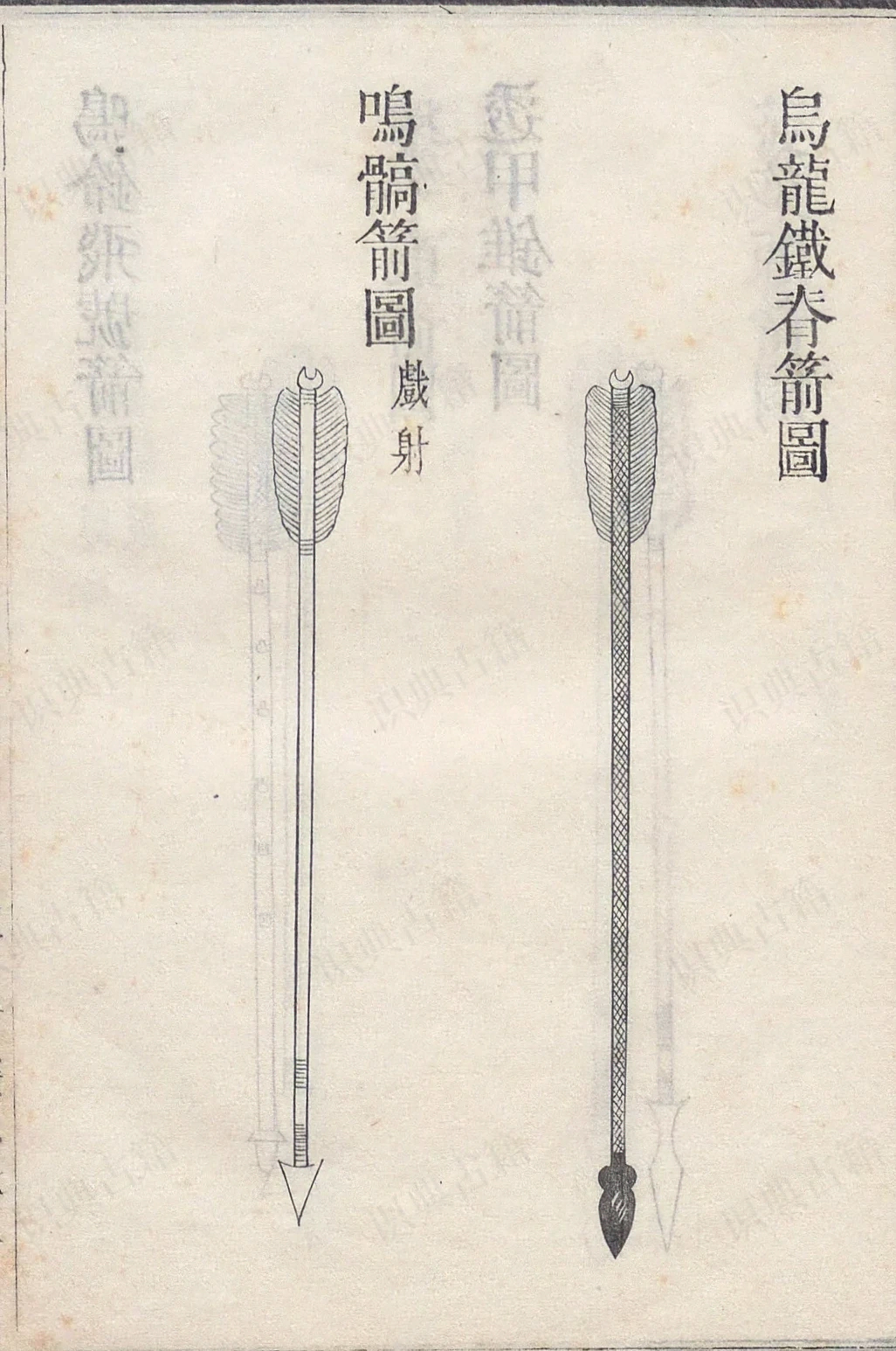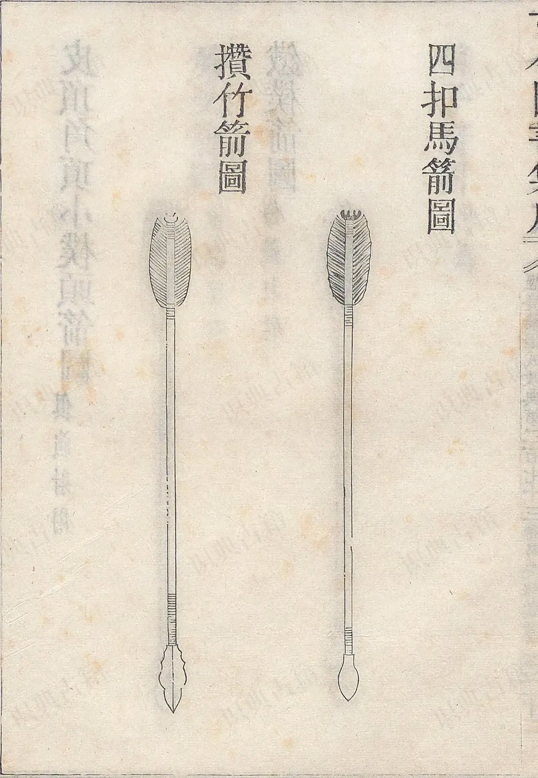攒竹箭图、无扣箭图,荞麦棱箭图、半边扣箭图,杂箭鞭箭图、筒子箭图、袖箭诗弓厢图、行弓厢图、焙弓火候天工开物图支