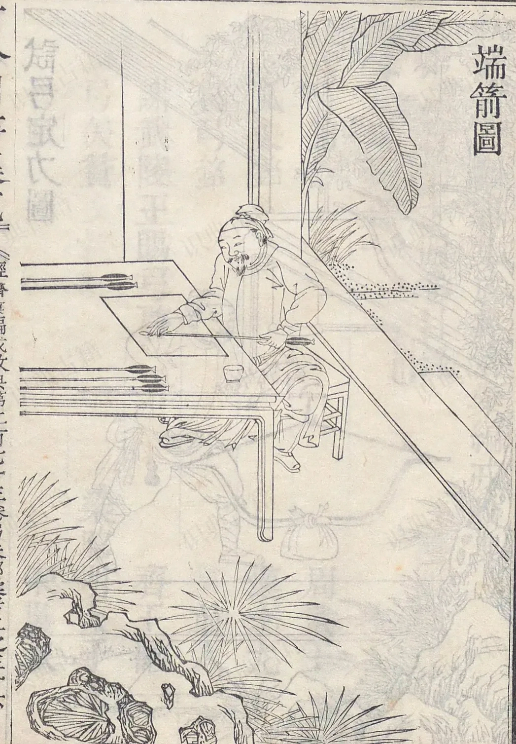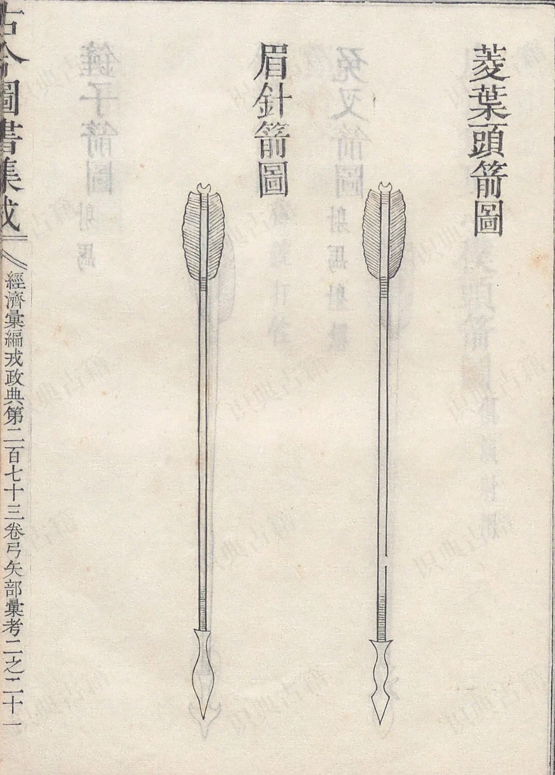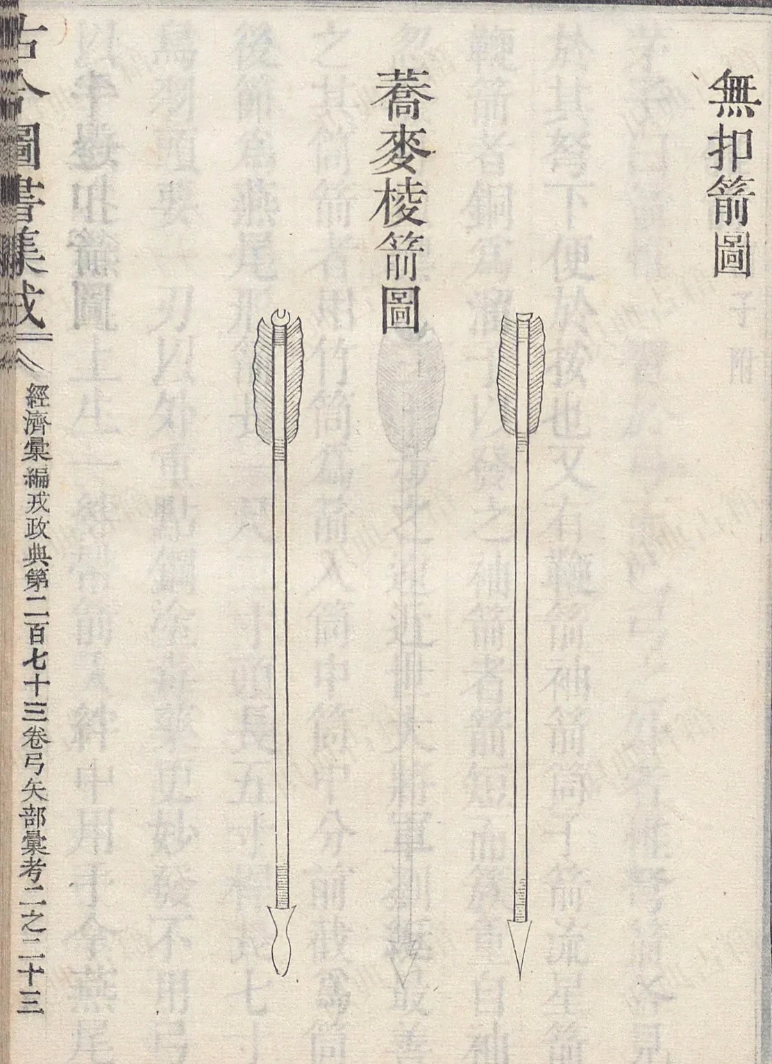 攒竹箭图、无扣箭图,荞麦棱箭图、半边扣箭图,杂箭鞭箭图、筒子箭图、袖箭诗弓厢图、行弓厢图、焙弓火候天工开物图支