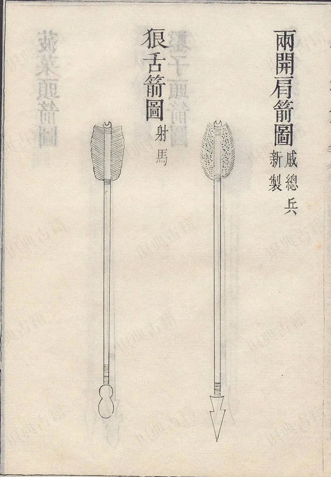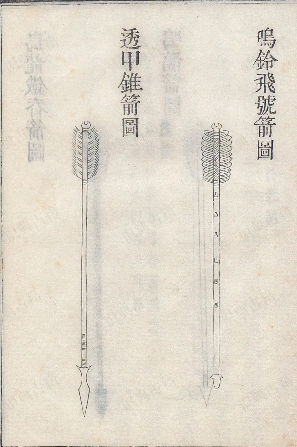武备志箭图鸣髆箭图、鸣铃飞号箭图、透甲锥箭图、菠菜头箭图,凿子头箭图,两开肩箭图,狼舌头箭图,月牙箭图、艾叶头箭图、柳叶箭图,三义箭图、月菱叶头箭图,