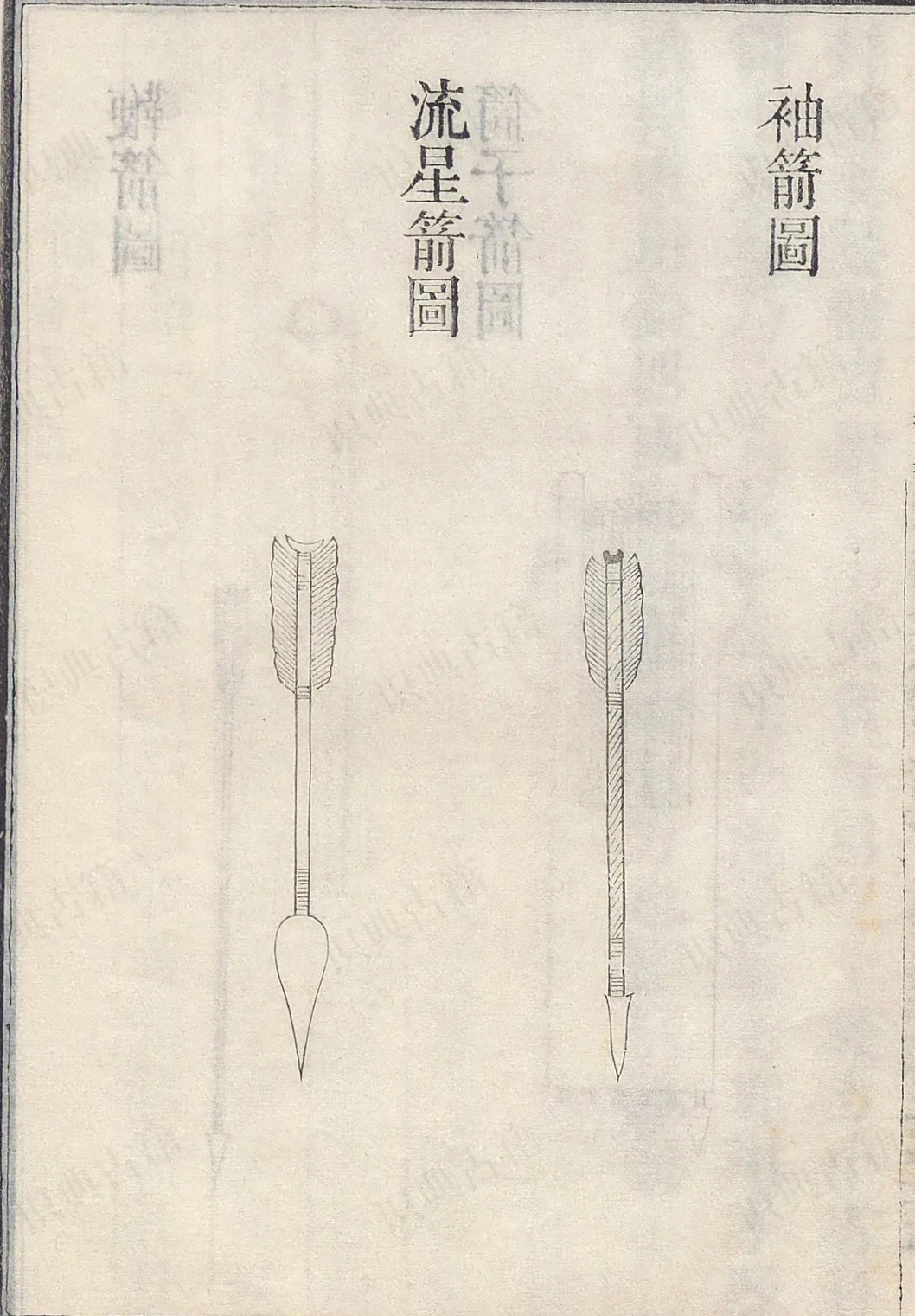 茅子曰:箭惟一习于弓而已。弓之外者,惟弩箭各见于其弩下,便于按也。又有鞭箭、袖箭、筒子箭、流星箭。鞭箭者,铜为溜子以发之;袖箭者,箭短而簇重,自袖忽发,可以御人三十步之远。近世大将军刘𬘩最善之。其筒箭者,用竹筒为箭,入筒中,筒中分前截为筒,后节为燕尾形。箭长一尺二寸,头长五寸,杆长七寸,鸟羽头要氏刃,以外重点钢,涂毒药更妙。发不用弓,以手发之。燕尾上生一绊,带箭人绊中,用手拿燕尾。七鹏并箭要紧,尽力发之。力大者每筒二十枝,力小者每筒十五枝,乃一人敌十人法也。流星箭者,亦用手发铁杆,中用铅四两,取其重而有力也。总曰杂箭。
