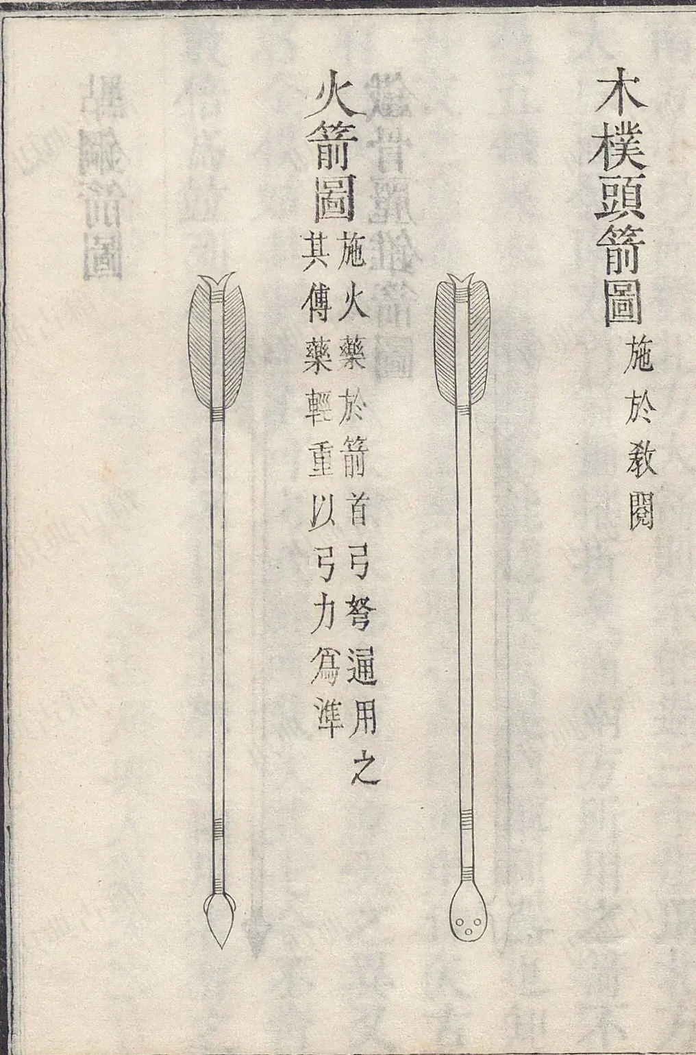 凡竹箭,其体自直,不用矫揉。木杆则燥时必曲。削造时,以数寸之木刻槽一条,名曰箭端,将木杆逐寸戛拖而过,其身乃直。即首尾轻重,亦由过端而均停也。