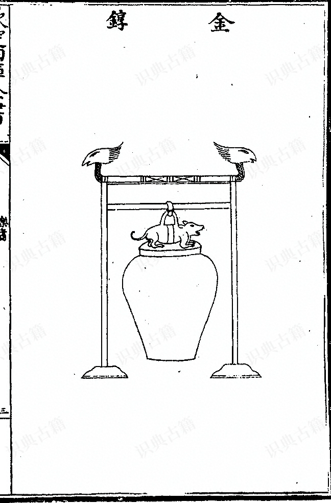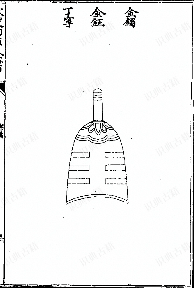 周官小师掌六乐声音之节与其和”,鼓人掌六鼓四金之音声,以金𬭚和鼓。自金声之淳言之,谓之𬭚,自和鼓之倡言之,谓之和,其实一也。盖其形象钟,顶大、腹𢴲、口弇,上以伏兽为鼻,内县子铃、铜舌,凡作乐,振而鸣之,与鼓相和。后周平蜀,获其器,太常卿斛斯证观曰:𬭚于也,以芒筒捋之,其声极振,乃取以合乐焉。国语曰:战以𬭚于,儆其民也。又黄池之会,吴王亲鸣钟鼓、𬭚于振铎,则𬭚之和鼓以节声乐、和军旅,其来尚矣。后世之制,或为两马之形,或为鲛龙之状,引舞用焉,非周制也。宋史云:广汉