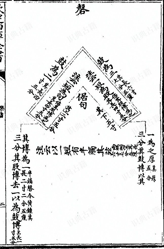 考工记:磬氏为磬,倨勾一矩有半,其博为一,股为二,鼓为三。叁分其股博,去一以为鼓博;叁分其鼓博,以其一为之厚。己上则摩其旁,已下则摩其耑。磬师掌教击磬,盖石乐之器也,声乐之象也。古之为磬,尚象以制器,岂贵夫石哉?尚声以尽意而巳。钟圆中规,磬方中矩,则倨勾一矩有半,触其弦也,其博为一,股博一律也。股为二,后长二律也。鼓为三,前长三律也。股非所击也,短而博,鼓其所击也,长而狭。郑司农云:股,磬之上大者,鼓其下小者。康成云:股外面,鼓内面。则击者为前而在内,不击者为后而在外。内者在下,外者在上,其大小长短虽殊,而其厚均也。黄钟之磬,股、鼓皆厚二寸,则余磬可推矣。史传论造磬者多矣,或谓黄帝使伶伦为之,或谓尧使母勾氏为之,或谓叔为之。以明堂位考之,叔之离磬,则特县之磬。然则非特县之磬,未必非勾氏、伶伦所造也。曲礼言立则磬折垂佩。考工记言磬折以叁五。则磬取屈折之义也。先儒谓磬之为言劲也,岂因屈折然邪?