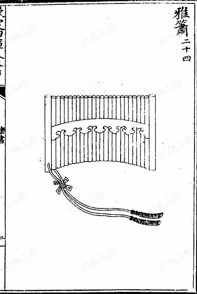 礼图:雅箫尺有二寸,二十四𫸩。颂箫尺有四寸,十六𫸩。郭璞谓大箫二十三管,小箫十六管。盖二十四管备律吕清浊之声,先王之制也。十六管兼十二律四清而为之,岂古制哉?圣朝教坊所用,长五六寸,十六管,有底,而四管不用,非古人制作之意也。